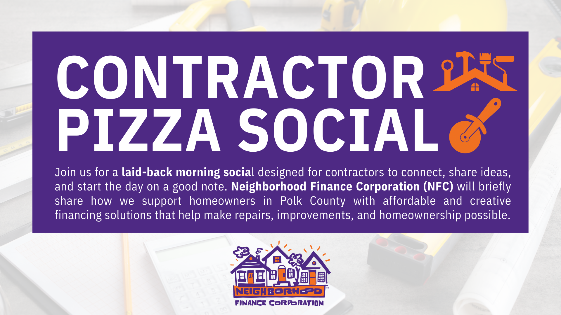 Join us for a laid-back morning social designed for contractors to connect, share ideas, and start the day on a good note. Neighborhood Finance Corporation (NFC) will briefly share how we support homeowners in Polk County with affordable and creative financing solutions that help make repairs, improvements, and homeownership possible.